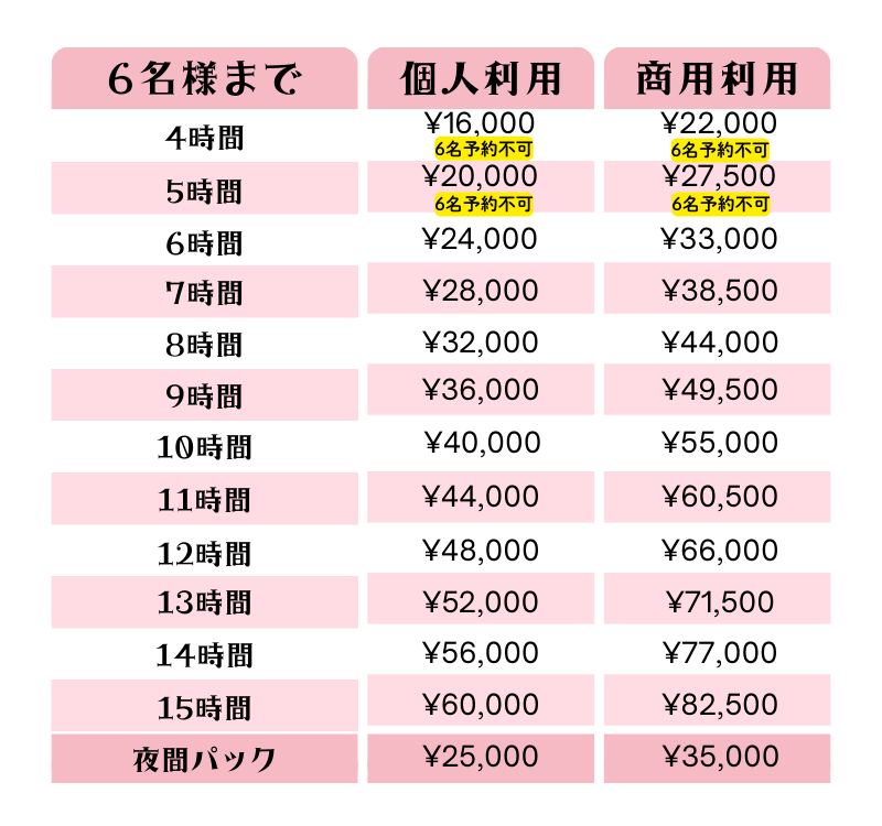 個人利用にてご予約頂いていたにも関わらず商用利用の撮影を行っていた場合には、違約金として倍額を追加で頂戴することになりますので、予めご了承ください。